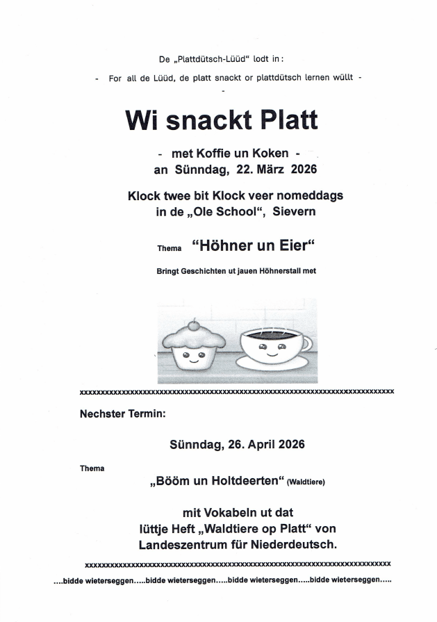 Von Anfang Oktober bis Ende April lädt Dorpleven Sievern e.V. zu Seniorennachmittagen in die Alte Schule ein. Dort treffen sich dann an jedem 2. und 4. Dienstag im Monat die Senioren, um in geselliger Runde zum Beispiel Skat zu spielen. Aber auch verschiedenen Gesellschaftsspiele stehen zu Auswahl. Die Nachmittag starten um 15:00 Uhr und enden gegen 17:00 Uhr.